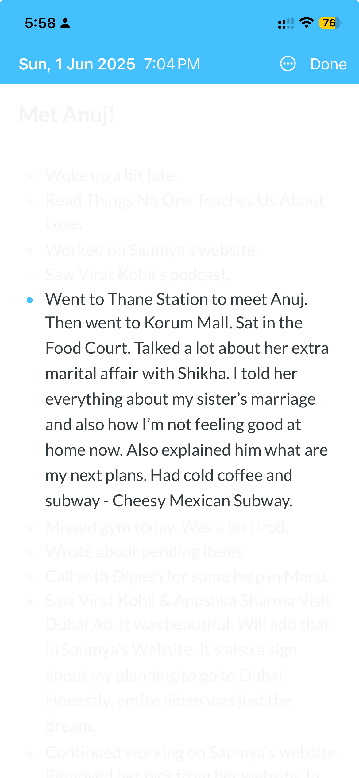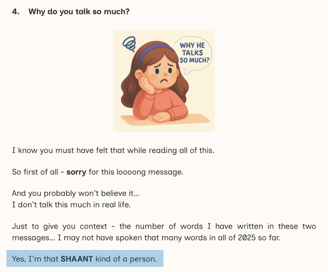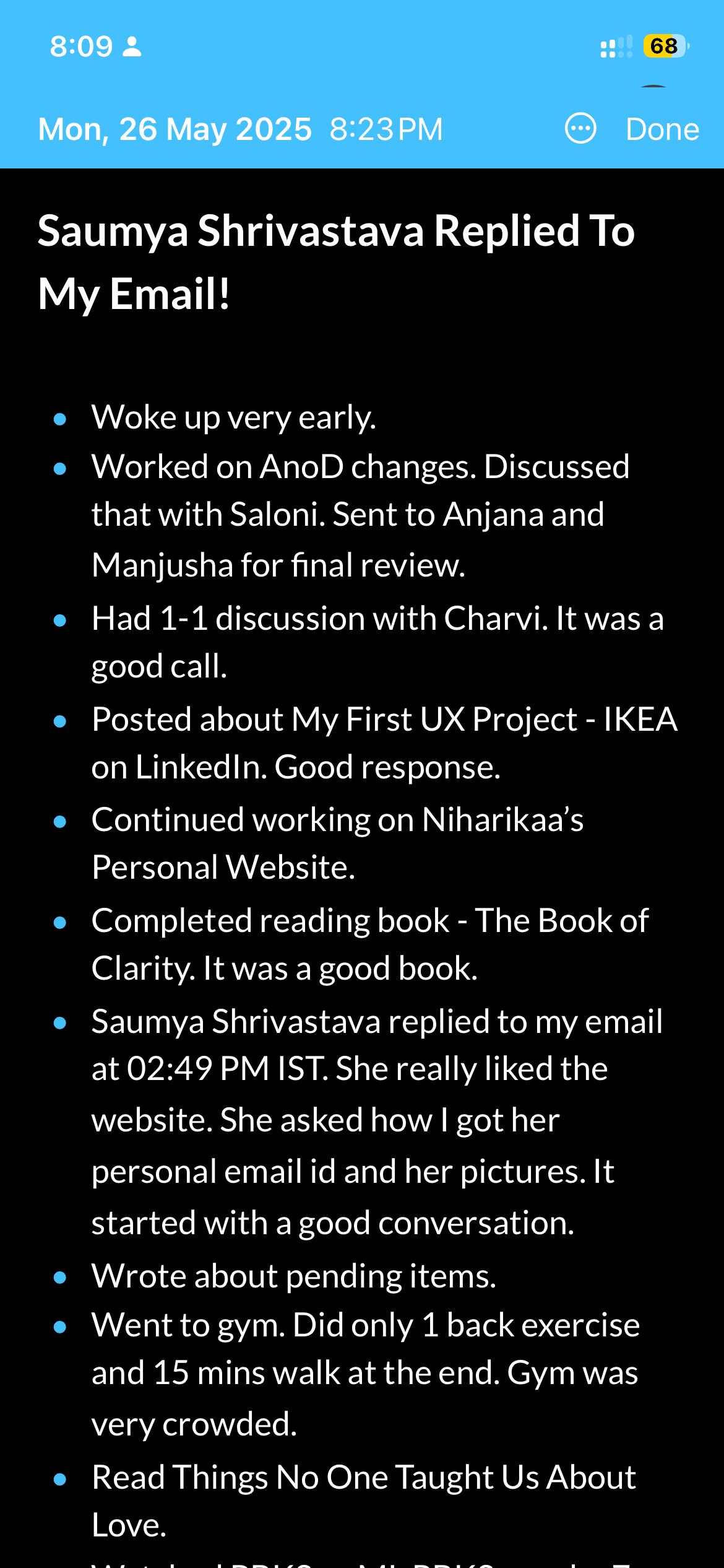 You know Saumya, I'm usually a very tough person. I can literally count on my fingers the number of times I have cried in the last 15–20 years. But today, while writing this particular section, even though I'm not trying to, I feel heavy. I feel emotional, and my eyes are just wet. Right now, I don't think I would be able to utter a single word if I had to. If someone tries to talk to me, I know I'll just cry. I'm, as usual, alone in my room and don't even know what I will say if someone walks in and sees me like this.
