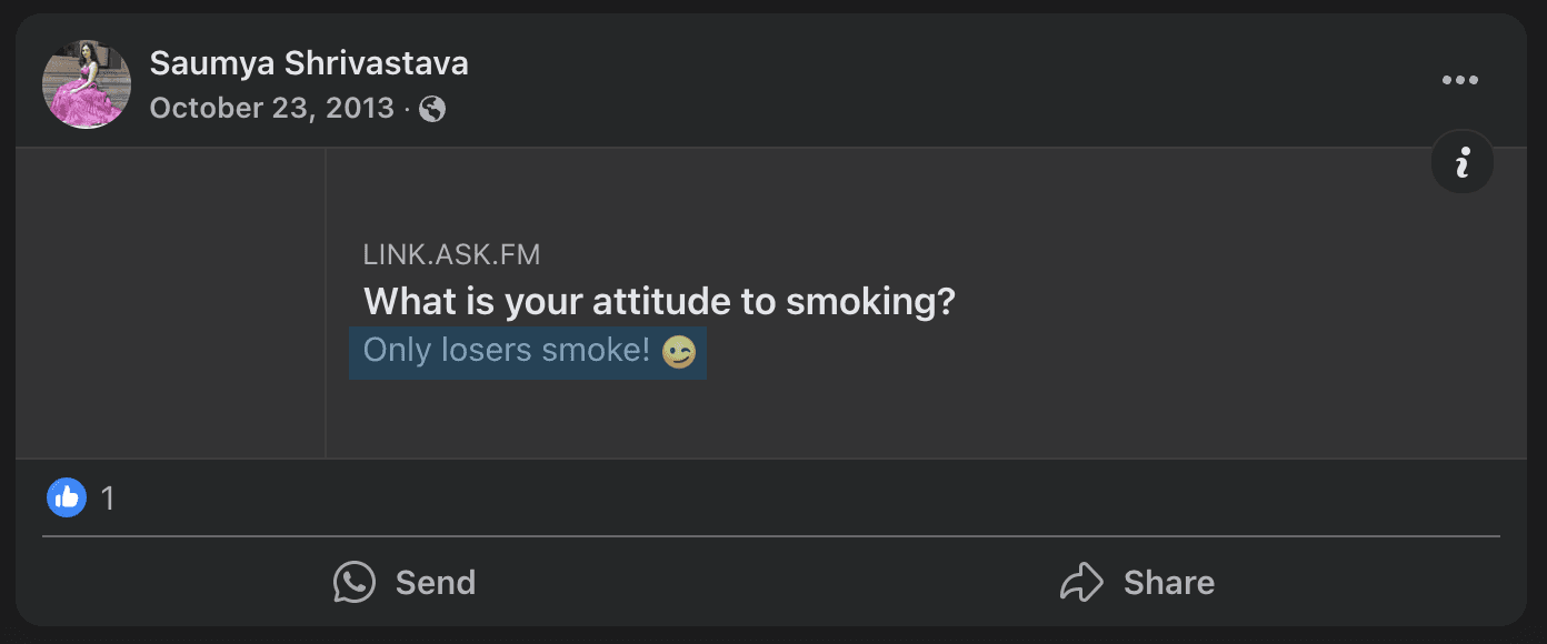 While checking your Facebook initially, I came across your view on smoking. I really liked that. :P
